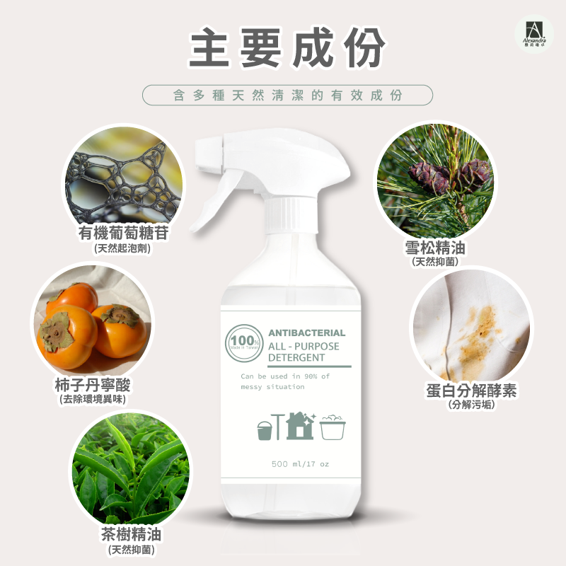 有機葡萄葡萄醣苷介面活性劑(ECOCERT有機成份認證),椰油醯胺丙基甜菜堿,天然椰子油介面活性劑,天然柿子單寧酸、勝態分解酵素,蛋白分解酵素、食品級檸檬酸,食品級小蘇打,植物性甘油,食品級抗菌劑,1.2丙二醇,茶樹精油、雪松精油
